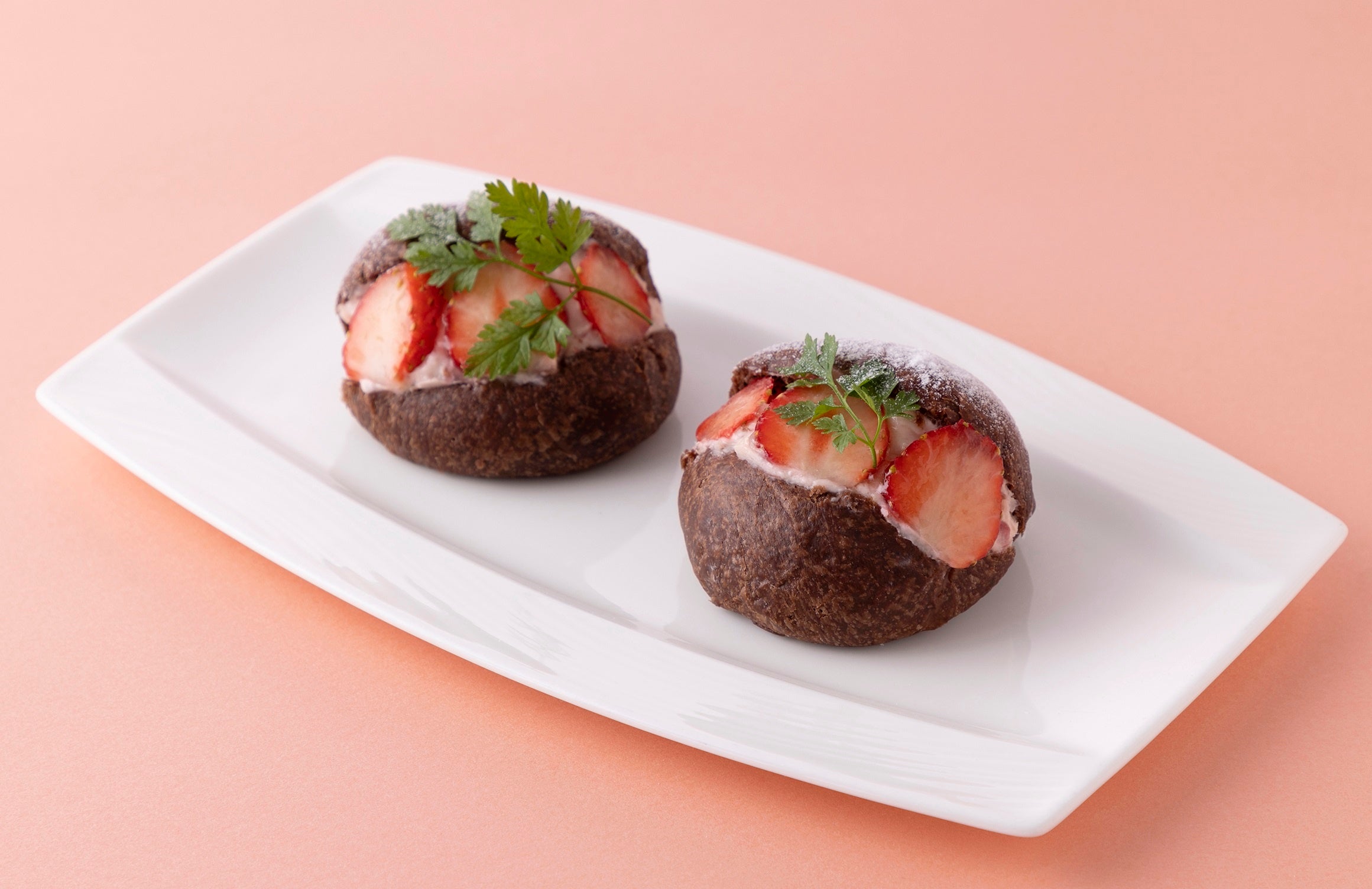ココア風味のバターたっぷりの生地にいちごクリームチーズを絞り、いちごをトッピングした、マリトッツォ仕立てのパン。