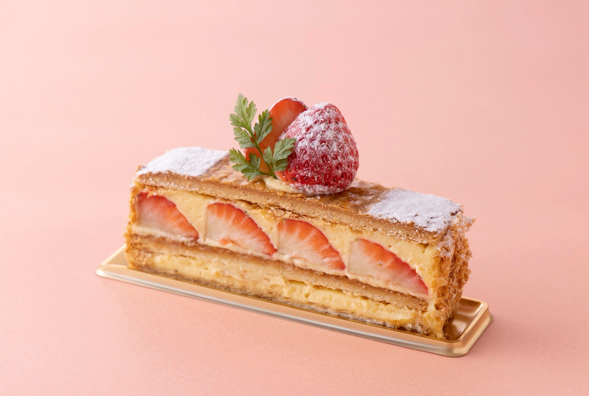 いちごは「紅ほっぺ」を使用。発酵バターを使った、ザクザク食感のパイにムースリーヌとフレッシュないちごを重ね合わせた食べごたえのあるミルフィーユです。