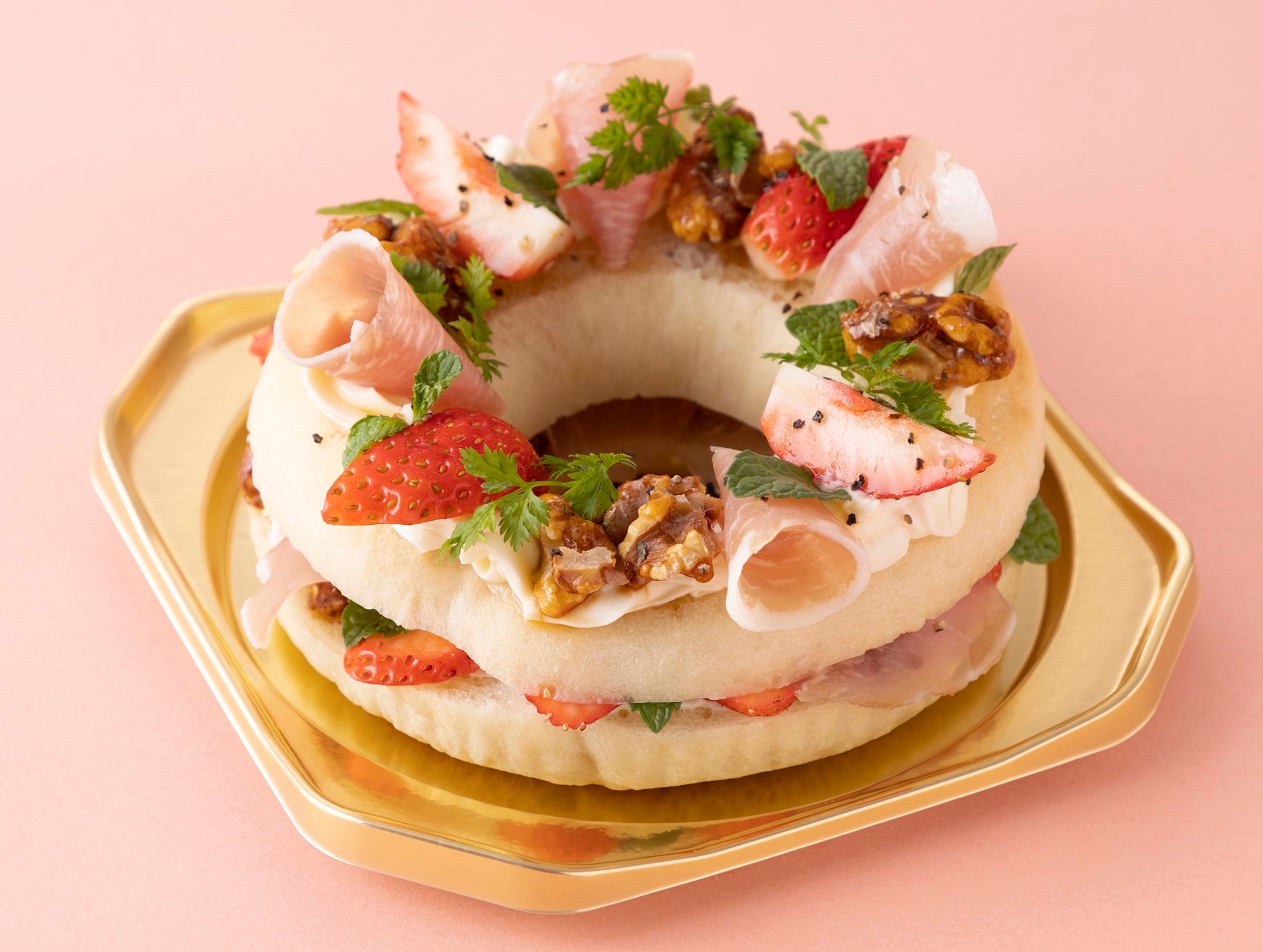 豆腐パンに、いちご、クリームチーズ、生ハム、くるみなどをサンドし、ケーキ風にデコレーションしました。