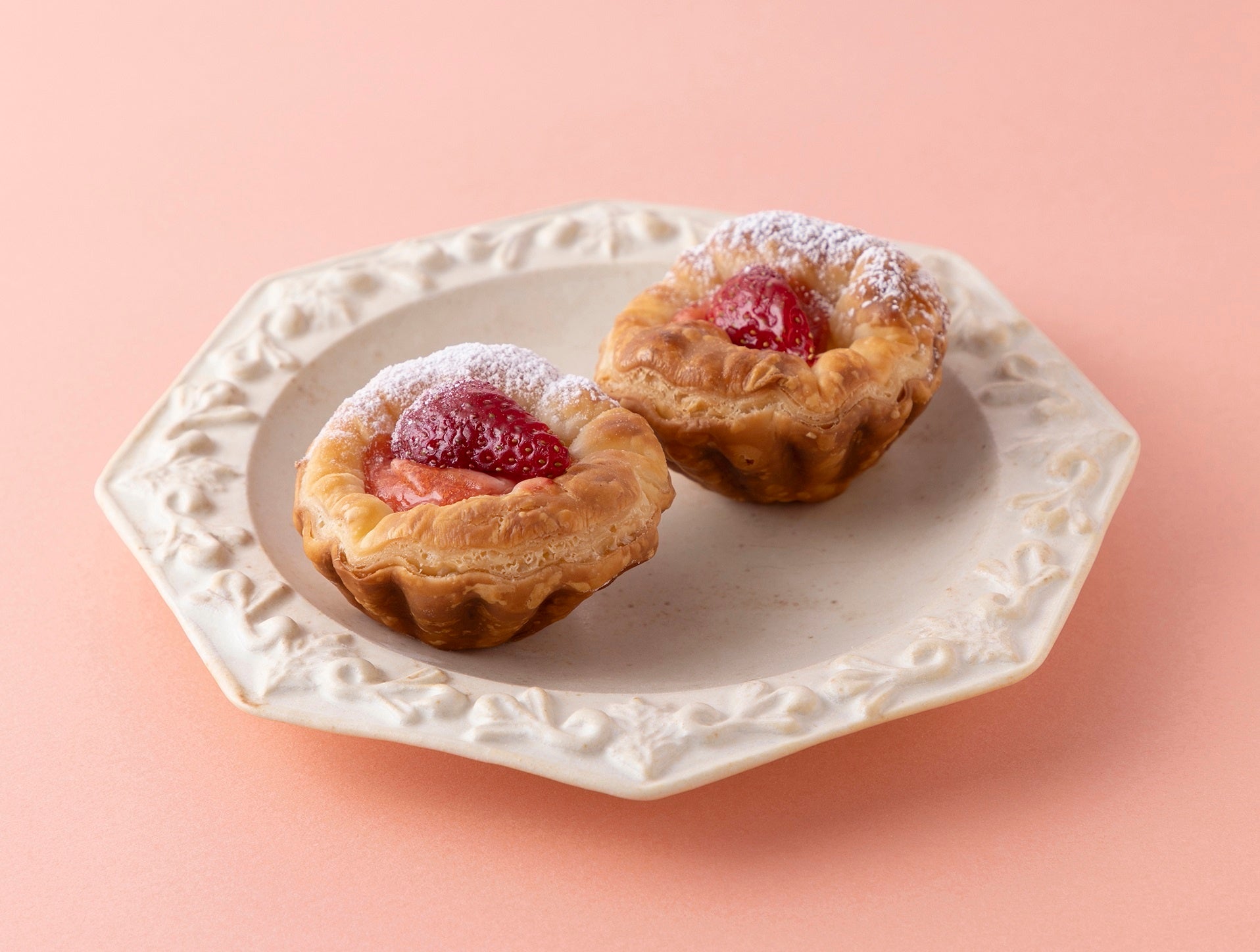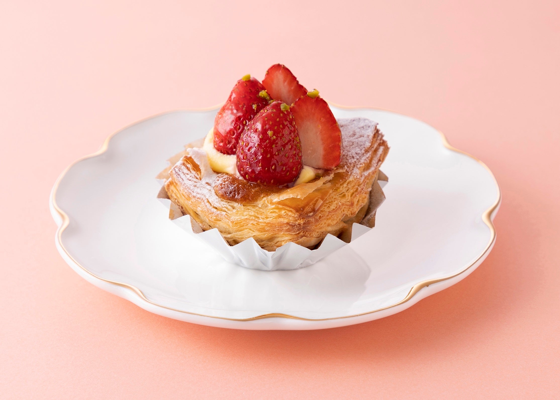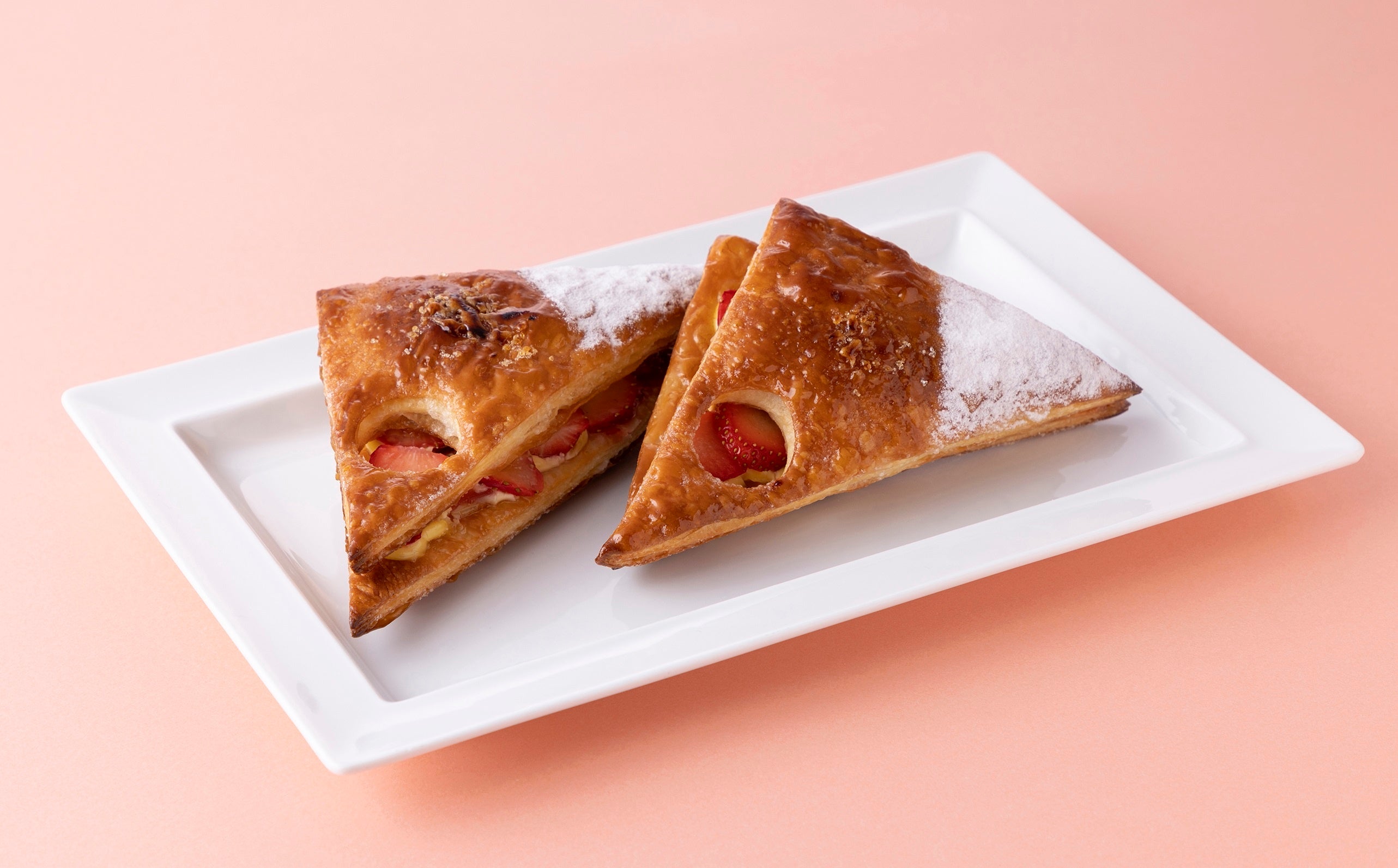 ドライいちご入りカスタードクリームといちごのスライスをサクサクのデニッシュで挟みました。