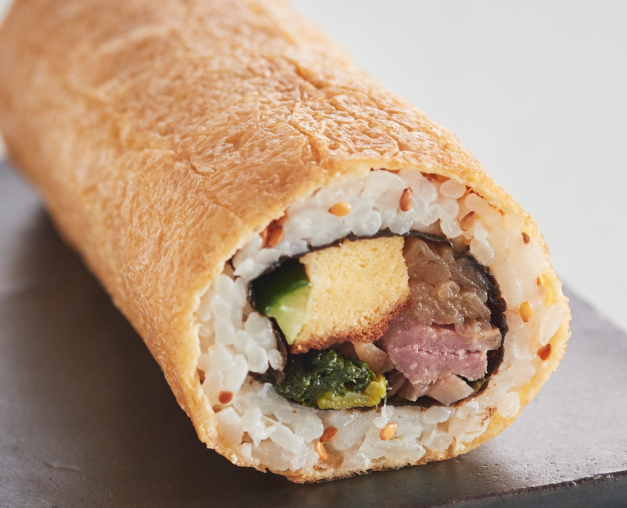 「津軽かもと菜の花のいなり恵方巻き」は、新登場の商品。旨みのある「津軽かも」のローストや菜の花を、甘辛く炊いた揚げで巻いた恵方巻きです。