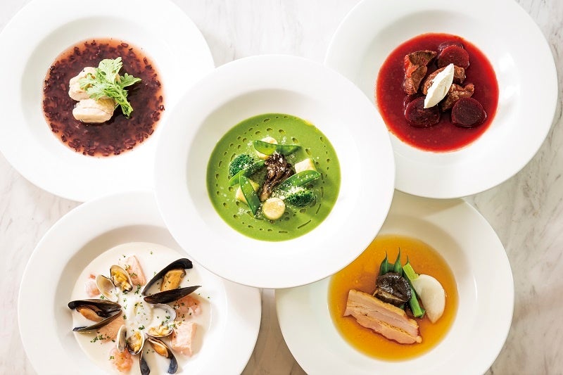 インスパイアされたのは、当ホテルの位置する汐留、そして自由ケ丘、新宿、銀座、神楽坂の5つの街。シェフが思うそれぞれの街のイメージカラー「白・緑・黒・赤・黄金」の5色のスープの中から、ディナーコース中の1品としてお選びいただきます。