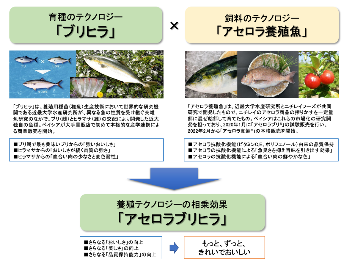 近畿大学(大阪府東大阪市)と、アセロラ事業を手掛ける大手食品メーカーの株式会社ニチレイフーズ(東京都中央区)が共同開発した「アセロラブリヒラ」を、北関東を中心に食品スーパー136店舗を展開している株式会社ベイシア(群馬県前橋市)の全店舗※で、令和5年(2023年)1月11日(水)から販売します。販売はベイシア限定となります。「アセロラブリヒラ 」は近畿大学が開発したブリとヒラマサのハイブリット種である「ブリヒラ」に、アセロラの抗酸化機能による品質保持効果を期待して、一定期間アセロラの搾りかすを含有した餌を与えた養殖魚です。最先端の養殖技術と飼料の技術でさらなるおいしさと美しさを追求して開発しました。※ベイシアマートを除く