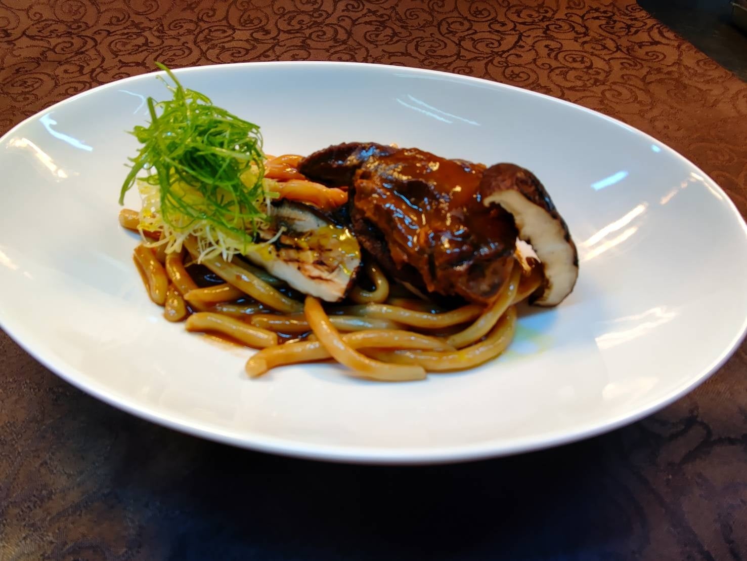 「“100%愛知県食材の生パスタ”鹿の骨付スネ肉と原木椎茸の味噌煮込み風、柚子胡椒と葱のサラダ添え」