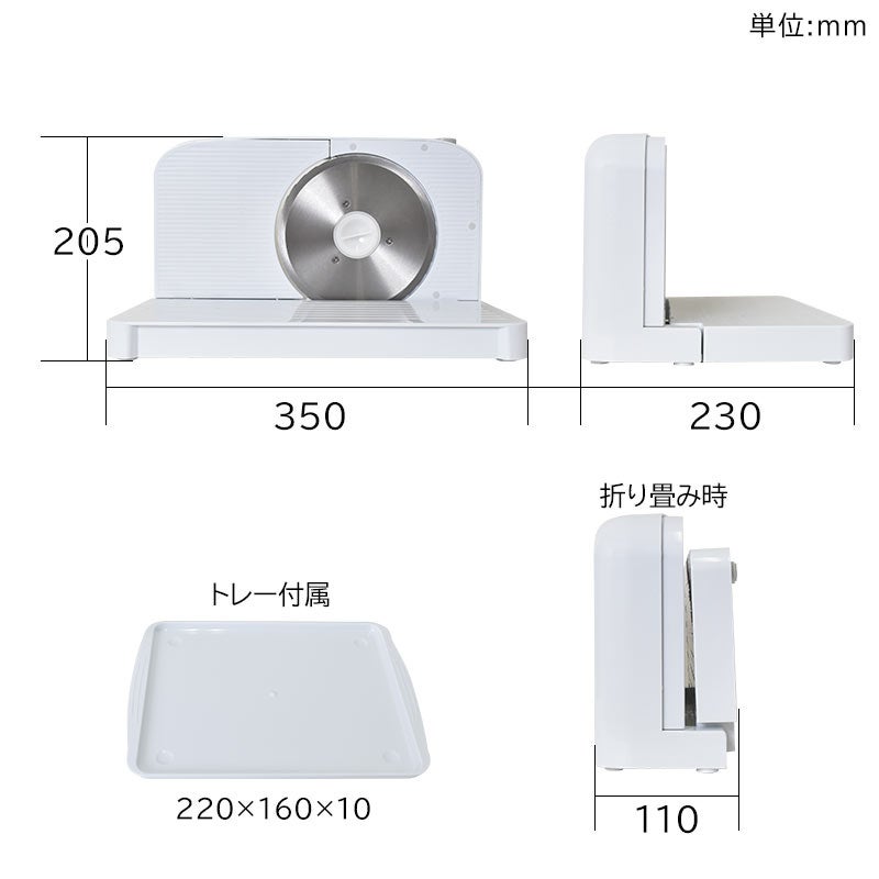 幅350×高さ205×奥行230(折りたたみ時110)mm。使用するときはベース部をセットして使用。ベース部にカットしたいお肉をのせ、本体のダイヤルでカットする厚さを調整。