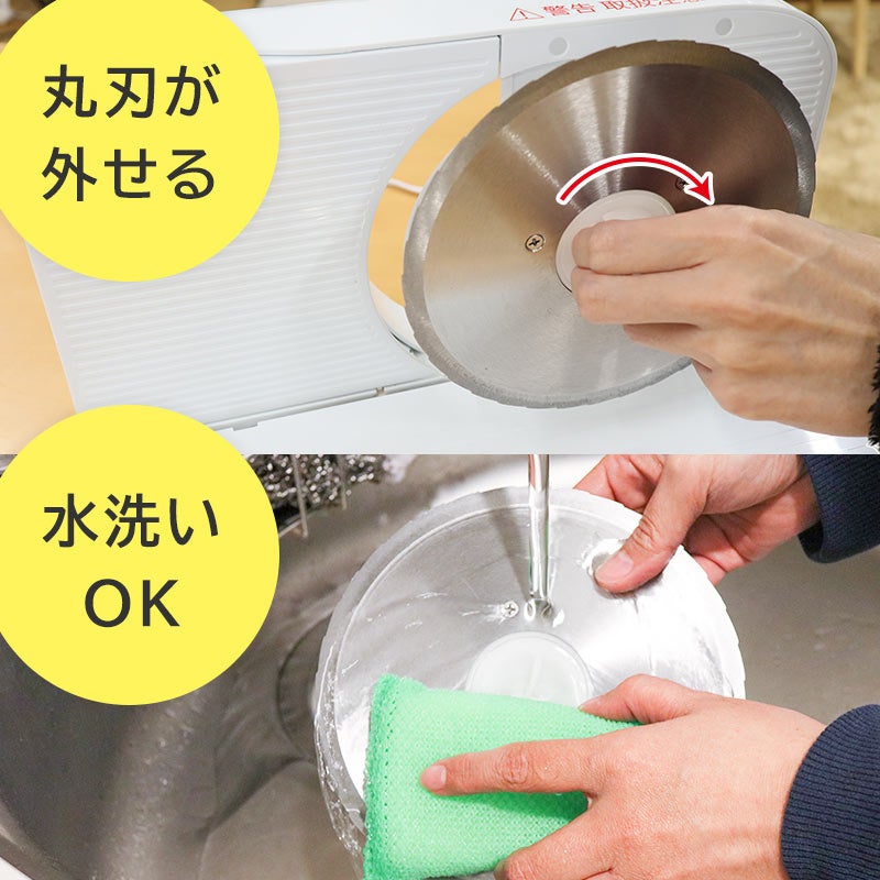 肉を押さえているホルダーを押しながら本体の電源ボタンと安全スイッチを同時に押すと、本体の丸刃が回転しお肉をスライスしていきます。カットする厚さは1~15mmに対応。お肉以外にもチーズやパンなどにもお使いいただけます。カットできる食材のサイズは幅120×高さ90×奥行130mmまで対応。刃は取り外して水洗い可能。いつでも清潔にお使いいただけます。