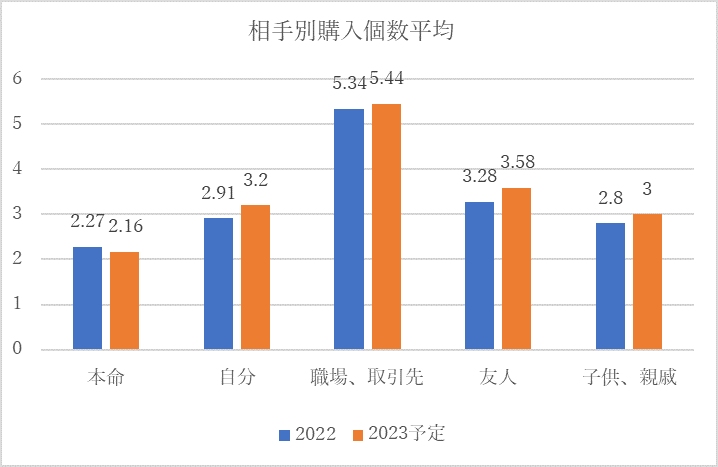 購入予定金額で最も高かったのは、「自分」向けの3329円で、昨年の2950円より379円も増加。また、すべての相手に対しても予算UP予定という結果になりました。
