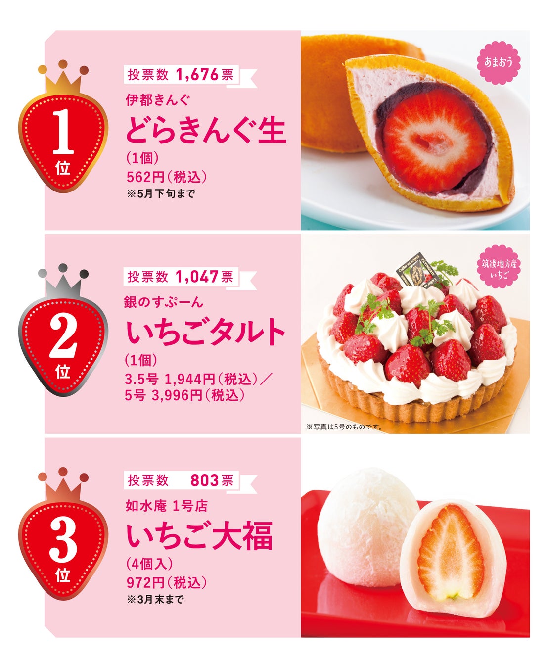 博多あまおうをはじめとした九州産のいちごを使用したスイーツがいっぱいのマイングでは、お客様投票でいちごスイーツ人気No.1を決める毎年人気のコンテストも実施。