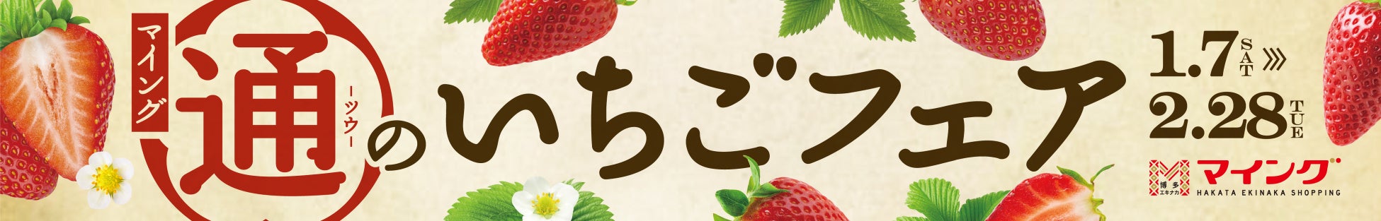 九州最大級のおみやげ処 「マイング」では、今年で7回目となるいちごスイーツフェアを「通(ツウ)のおみやげ通り」の核として、「マイング 通(ツウ)のいちごフェア」と題して開催します。