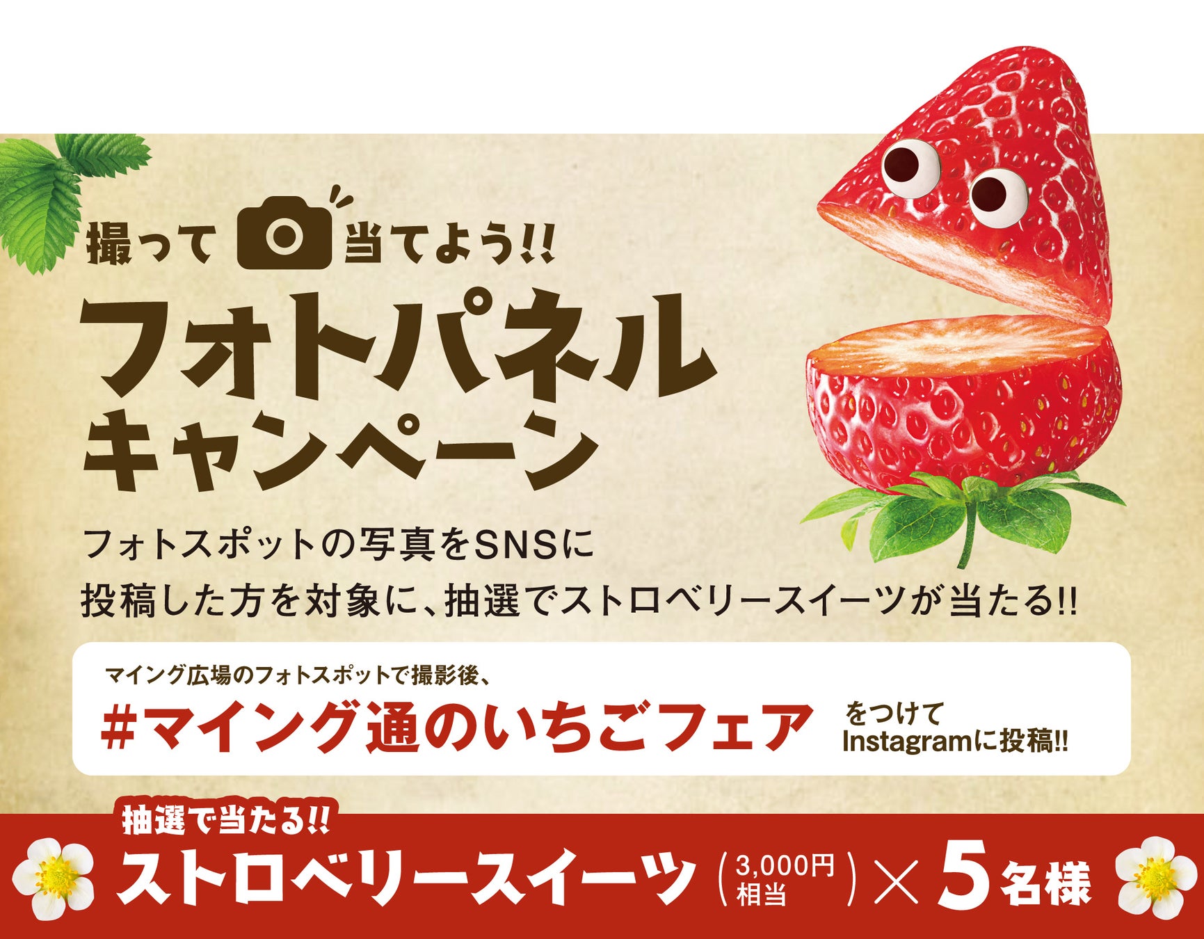 #マイング通のいちごフェア をつけてInstagramに投稿すると、抽選で5名様にストロベリースイーツ(3,000円相当)をプレゼントいたします。