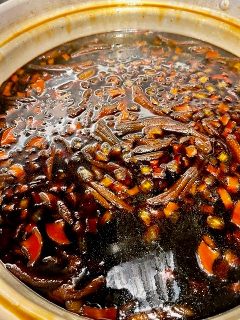高級寿司割烹のお店で8年修行した時の、穴子のつめタレのレシピを元に、アレンジを加え作り上げた秘伝のタレ。そのタレを使い煮穴子を煮上げ、毎日毎日タレを継ぎ足して煮ていく事で、旨味の濃い煮穴子が完成しました。