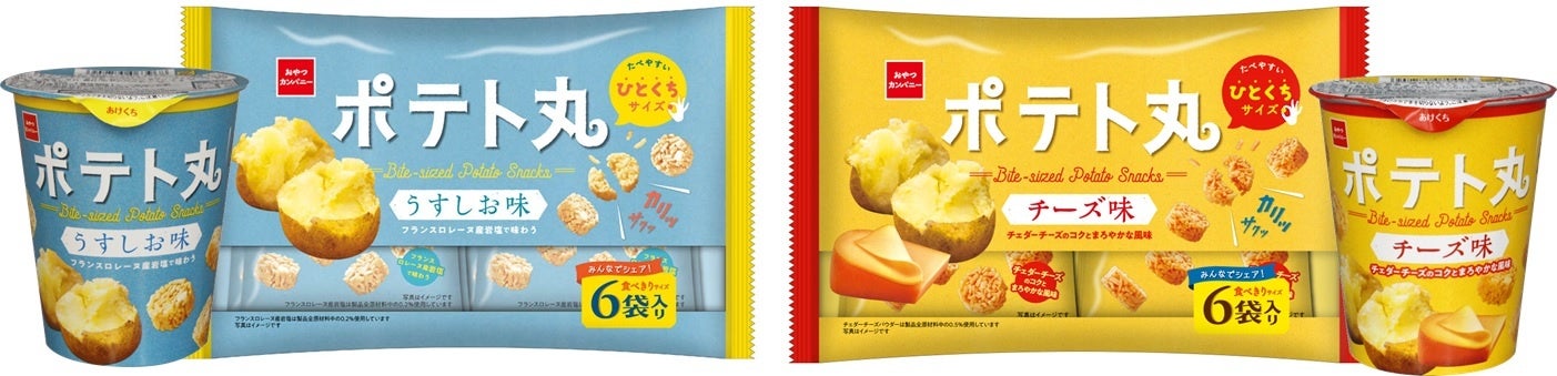 2019年の発売以来、お子様でも食べやすいひとくちサイズのポテトスナック菓子として親しまれてきた『ポテト丸』。2022年3月、大人たちのリフレッシュタイムに合うように味わいとパッケージをリニューアルしました。丸いカタチとカリッサクッとした軽快な食感はそのままに、ポテトの甘みと風味をアップ。「うすしお味」は、フランスロレーヌ産岩塩と北海道産利尻昆布エキスを使用することで、まろやかな塩気とあと引く旨味が口いっぱいに広がり、一緒に固めた味付けフリーズドライポテトダイスが、ポテトの風味をさらに際立たせ、食感と風味のアクセントとなっています。「チーズ味」は、チェダーチーズのコクとまろやかさがポテトの旨みとマッチし、濃厚であと引く美味しさ仕上げています。