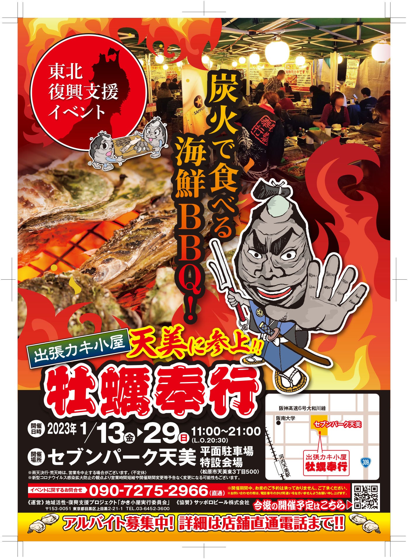 宮城県石巻の牡蠣をセルフ炭火焼き(海鮮BBQ)で楽しむ「出張カキ小屋 牡蠣(かき)奉行」(TEL 090-7275-2966)がセブンパーク天美(大阪府松原市)に期間限定オープン。期間は1月13日〜1月29日
