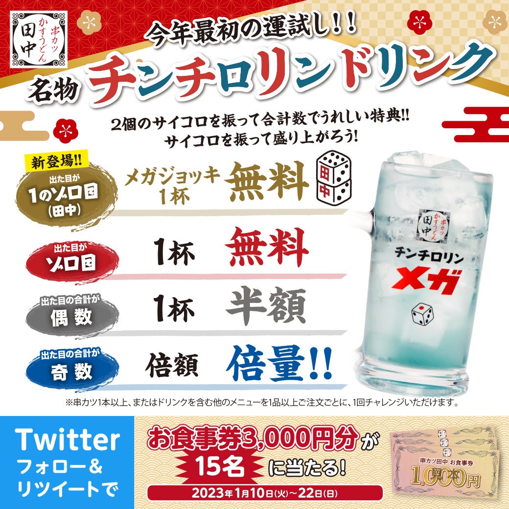 株式会社串カツ田中ホールディングス(本社:東京都品川区東五反田、代表取締役社長:坂本 壽男)は2023年1月10日(火)より、名物チンチロリンドリンクをご注文の際、1のゾロ目である「田中」が出たら、メガジョッキ1杯を無料で提供いたします。