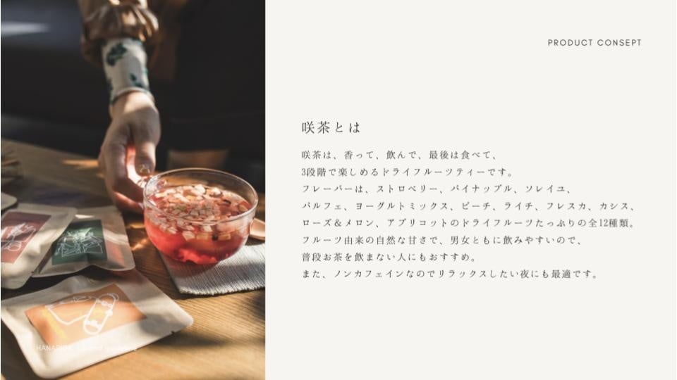 「大切な人に花を贈る」きっかけ作りのブランド。ドライフルーツたっぷりの茶葉まで食べられるお茶「咲茶」やドライフラワーフレームなど、花のある暮らしを支援する花のD2Cブランドです。