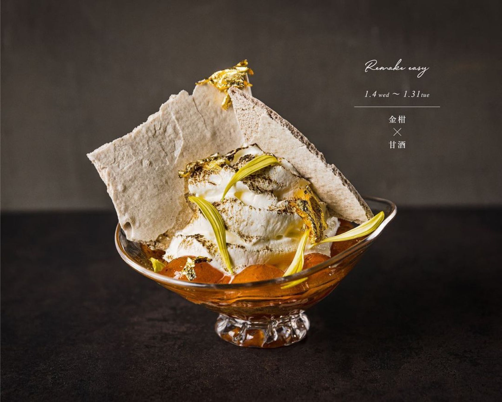 Remake easy株式会社が運営する、限られた人しか食べることができない特別なパフェと、パフェにペアリングしたカクテルを提供する会員制パフェバー「Remake easy」(リメイクイージー)から期間限定パフェ「金柑と甘酒のクレームダンジュパフェ」が2023年1月4日(水)から1月31日(火)まで登場します。