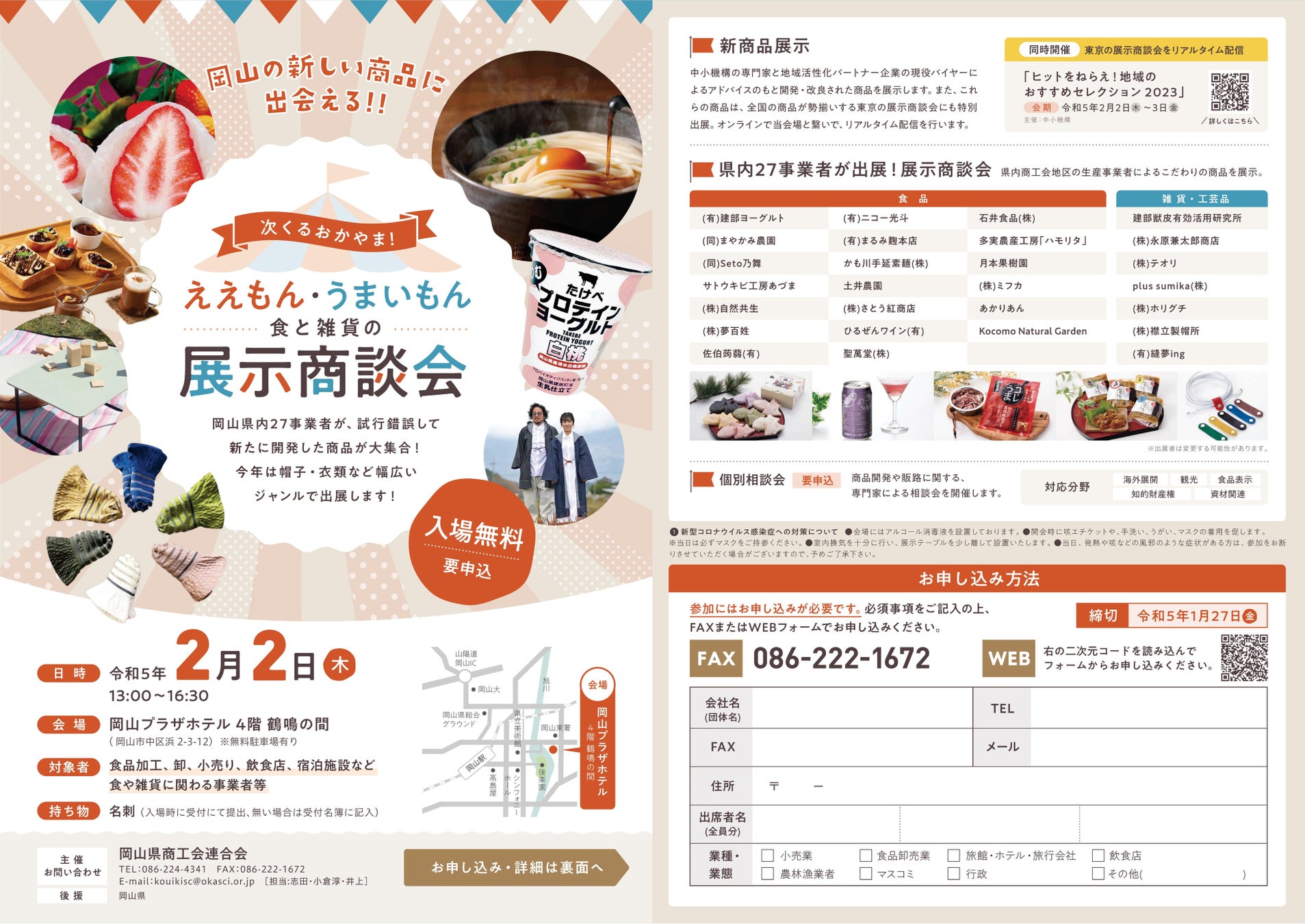 岡山県商工会連合会では、特産品(食品・雑貨)の販路拡大を目的に、県内商工会地区の生産事業者と小売・流通・サービス業者(バイヤー)との情報交換や、取引の機会を提供する展示商談会、『「ええもん・うまいもん」食と雑貨の展示商談会~次くるおかやま!~』を2023年2月2日(木)に岡山プラザホテルで開催いたします。