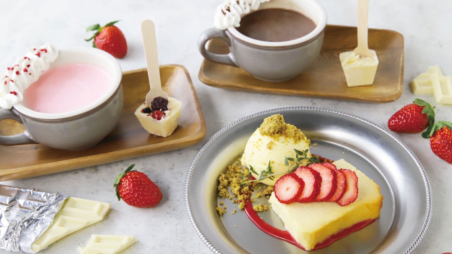 バレンタインプレートにも入っている濃厚テリーヌと、ホワイトチョコを溶かしながら楽しむホットドリンクもぜひどうぞ。
