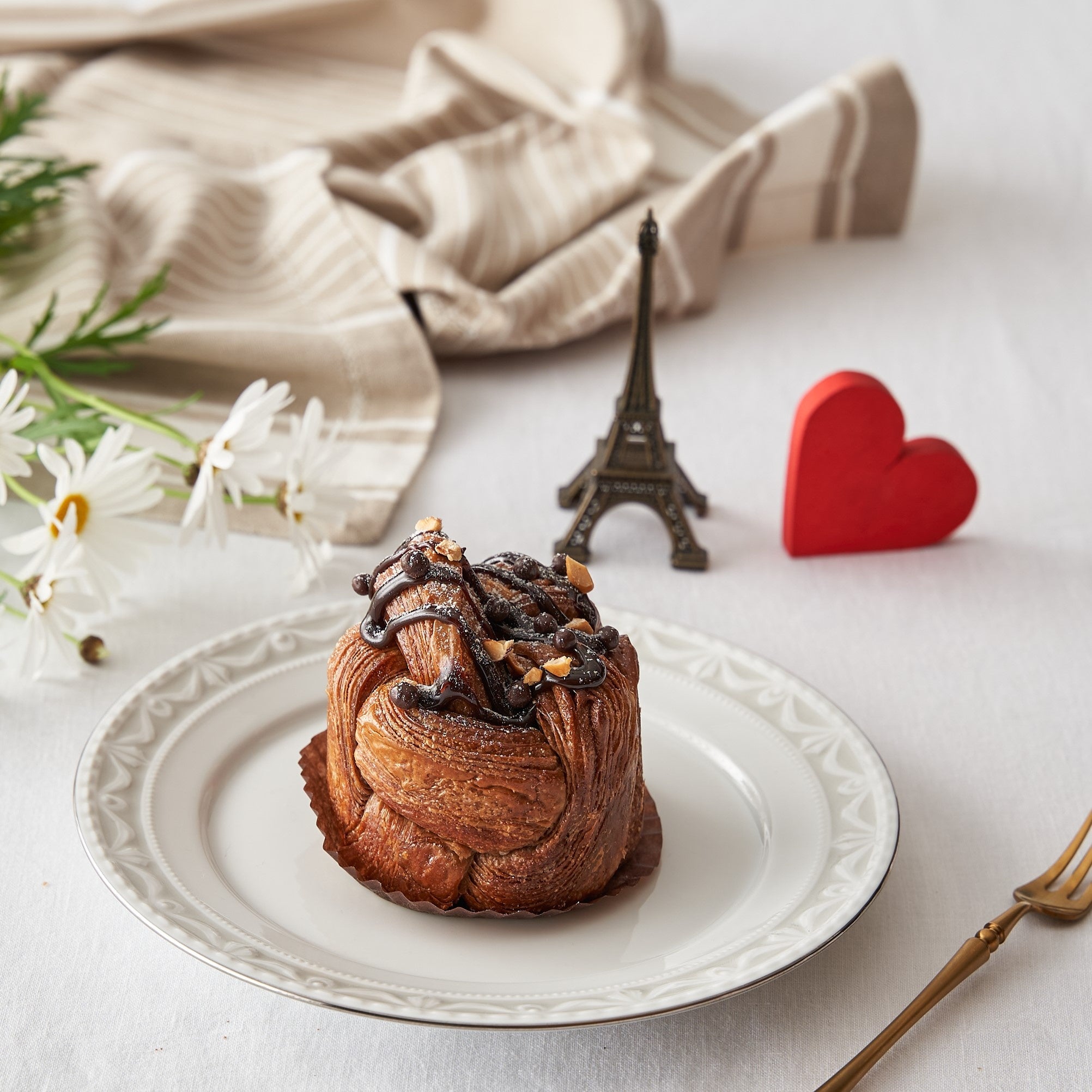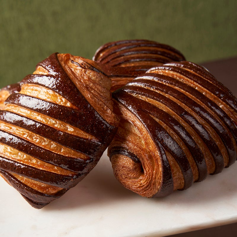 ショコラ生地とのバイカラーが可愛らしい限定のパン オ ショコラ。最高級のAOPバターたっぷりクロワッサン生地とココア生地のサックサク食感と濃厚なコクを感じるカカオバリー®のバトンショコラの味わいが楽しめます。