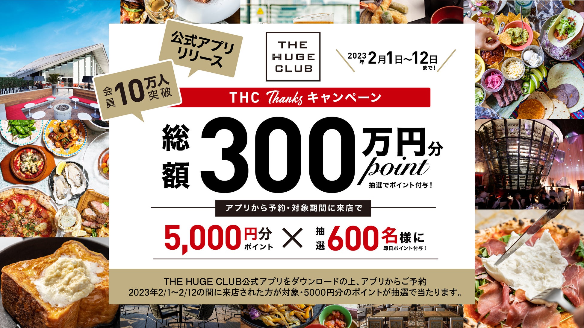 公式アプリリリースと会員数10万人突破を記念して「THC Thanksキャンペーン」を実施します。The HUGE CLUB公式アプリをダウンロード頂き、会員登録後アプリからご予約頂いた方に抽選で、5,000円分のポイントをプレゼントします。600名様、総額300万円分のポイントを会員の皆様に付与します。