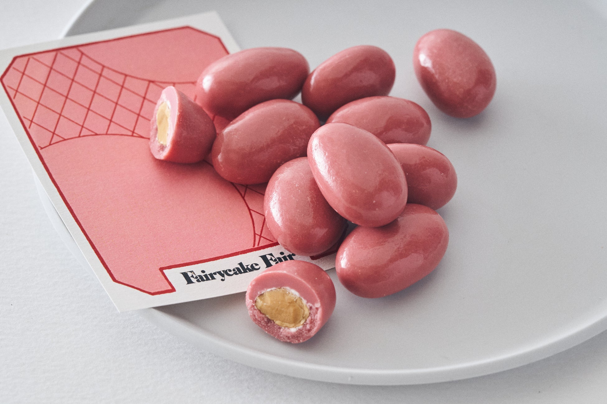 ルビーカカオから作られる”ルビーチョコレート”はルビーのような色と酸味が特徴。着色料もフルーツフレーバーも使わず、その鮮やかなピンクカラーとベリーのような味わいはまさに自然からの贈り物。ルビーチョコレート特有のカカオの風味と酸味を感じられるように、一粒一粒手作りでコーティングの厚さや中身のアーモンドのロースト具合を調整するこだわりよう。