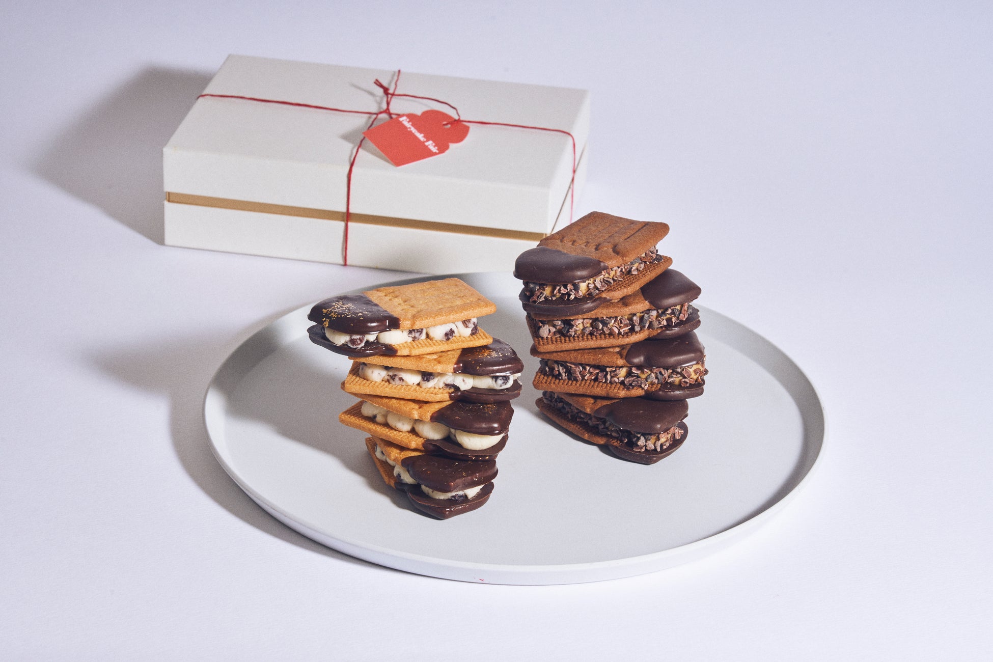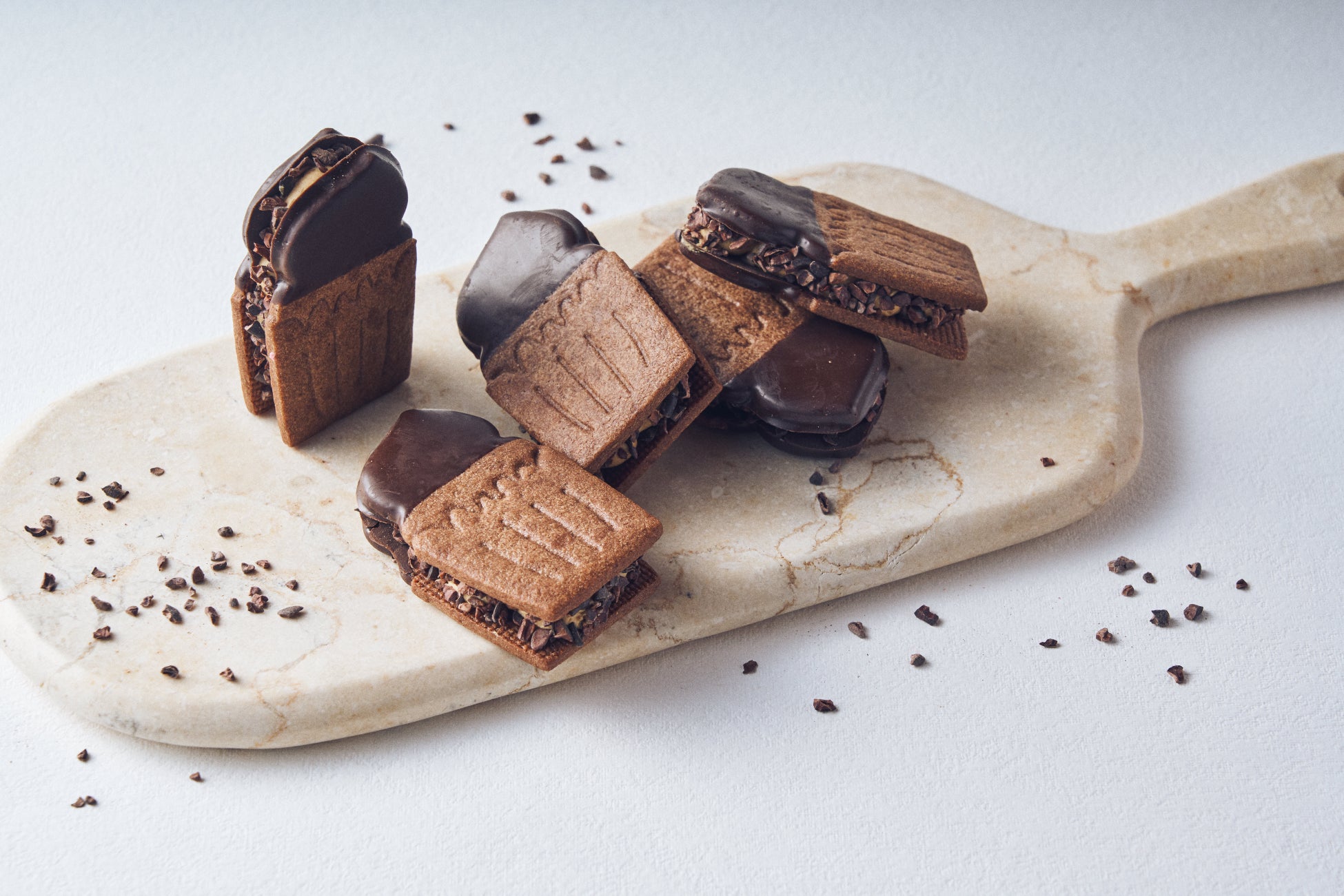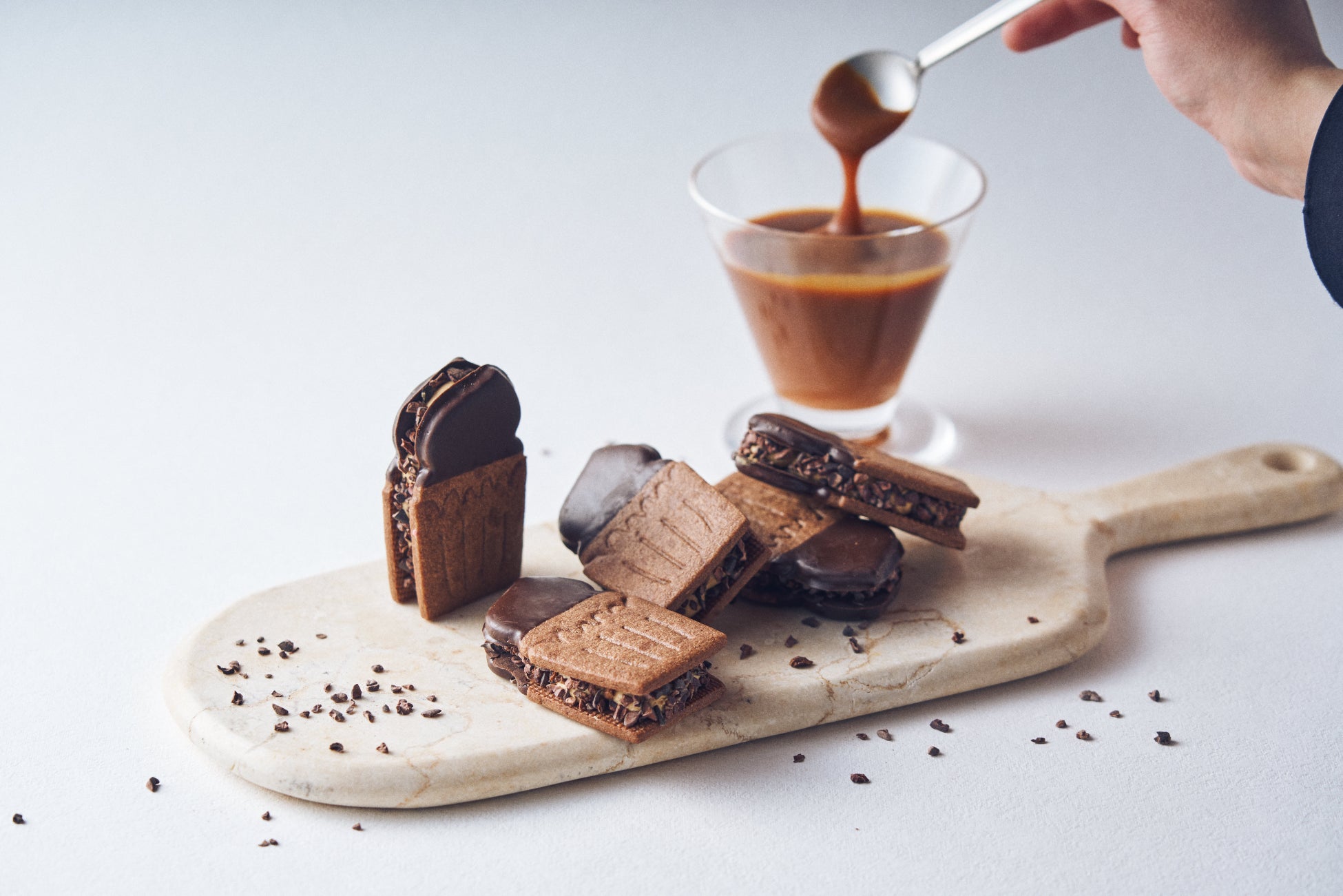 フランス産ゲランドの塩を使用し、セイボリーな甘さに仕上げた特製「塩キャラメル生バタークリーム」をダークチョコレートでハーフコーティングしたカカオビスケットへ一つ一つ丁寧にサンド。時間の経過とともにリッチなクリームとビスケットが馴染み“さっくり”としながらも“しっとり”とした独特の食感が楽しめます。