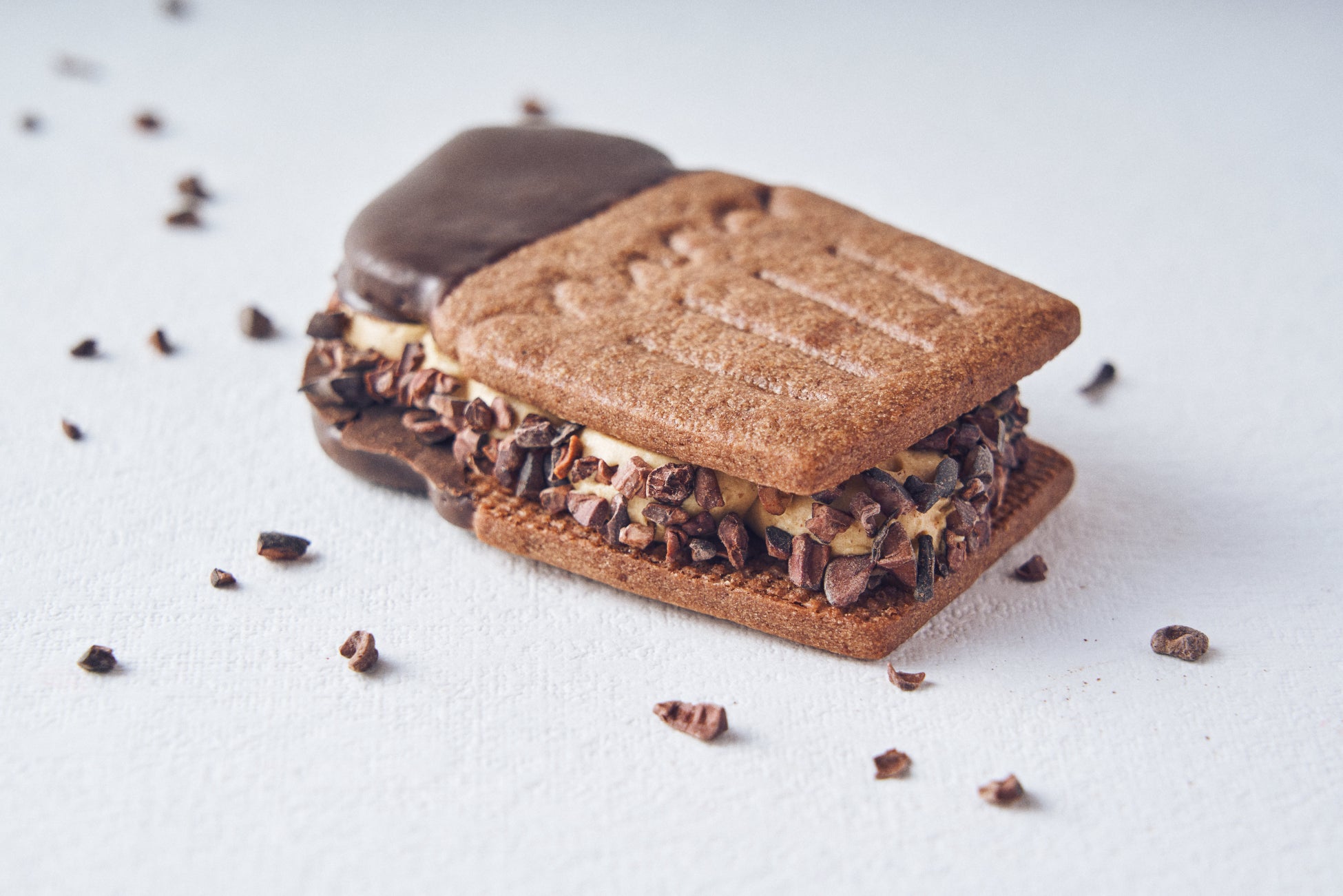 クリームの周りには栄養価の高いスーパーフード“カカオニブ”を散らしました。カカオニブは工房内で丁寧に焙煎して砕いたものを使用。このこだわりのひと手間を加えることで、カカオ特有の香り立つ風味とパリパリとした心地良いユニークな食感が生まれます。コーヒーや紅茶はもちろんワインとの相性も抜群。大人も喜ぶ贅沢生バターサンドです。