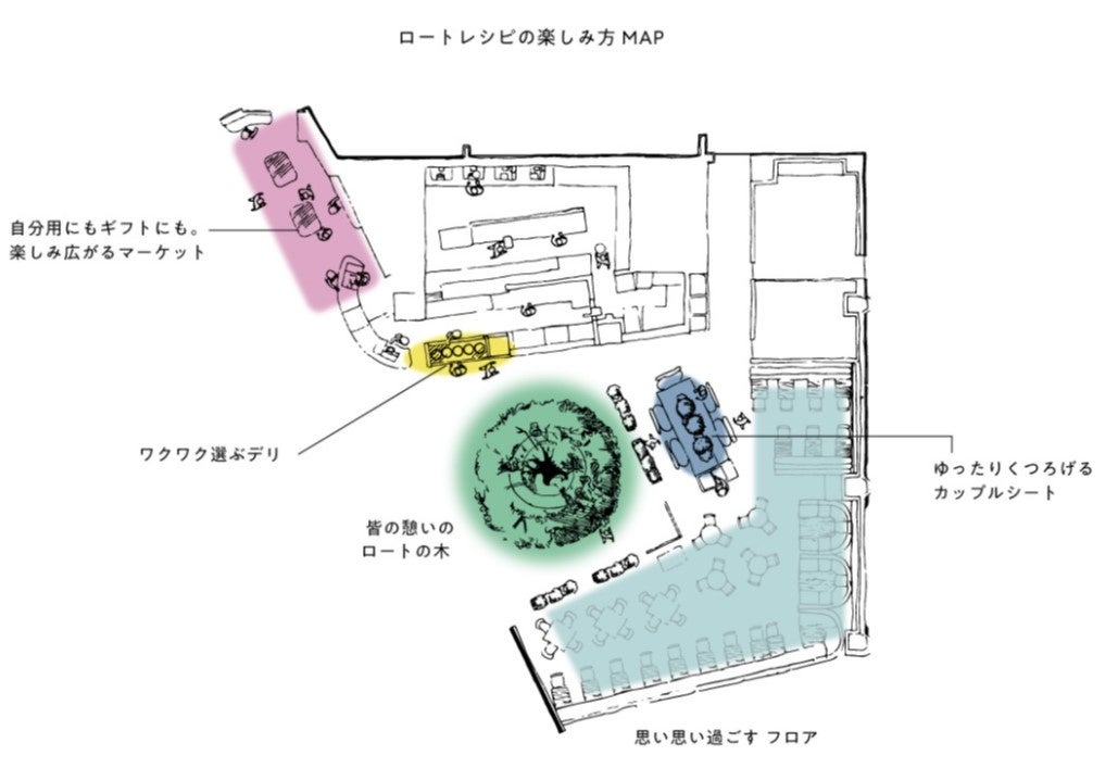 「ロートレシピ 茶屋町店」は食の新ブランド「ロートレシピ」の旗艦店として、飲食エリア(カフェ&レストラン)、物販エリア(マーケット)を起点に人々が集い、食事や会話を楽しんでいただける複合施設です。様々なお客さまにくつろいでいただけるよう、懐かしさとモダンさを融合させたデザインを施しています。店内飲食の他、ご自宅用の商品のご購入やその後も通販を通じて追加購入できるモデルを導入する等、幅広く利用いただけます。さらに今後、店内においてイベントやワークショップなどの実施を通じて、心身がさらに豊かになるコミュニティとしての役割も果たしていく予定です。店舗中央には、ご来店いただいた方の憩いの場となるような「ロートの木」を設置しています。