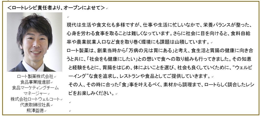 ロート製薬株式会社(本社:大阪府大阪市、社長:杉本雅史)は、2023年1月15日(日)に大阪府大阪市の商業施設「NU茶屋町プラス」の2階にオープンさせる食の複合施設「ロートレシピ 梅田NU茶屋町プラス店(以下、ロートレシピ 茶屋町店)」の概要・メニューを公開いたします。同店は「おなかの底から元気になれる」をコンセプトに、おいしく、健康的で、サステナブルな食事を提案する、食事業の新ブランド「ロートレシピ」の旗艦店です。パートナーとして「食を起点としたコミュニティづくり」でウェルビーイングな社会づくりに取り組まれてきたカフェ・カンパニー株式会社を迎え、共同で企画を進めてきました。なお、運営は当社の子会社である株式会社ロートウェルコートが行います。