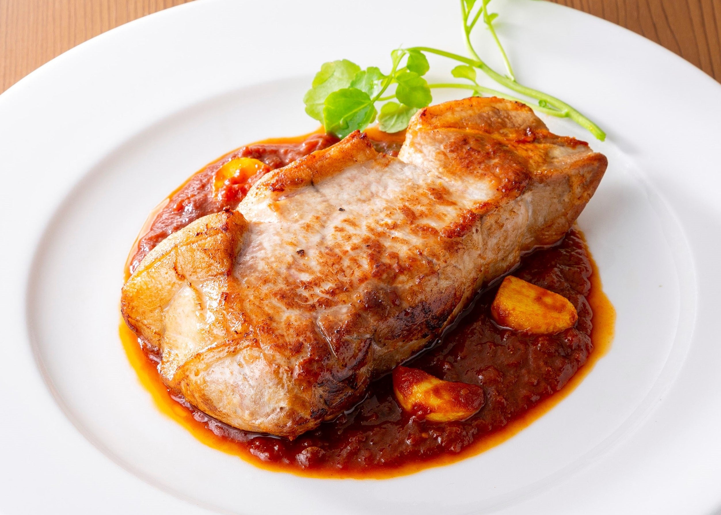メインはお肉で決まり。厚みのあるトンテキをド~ン!と迫力のボリュームでご提供。トマトベースのソースで仕上げました。