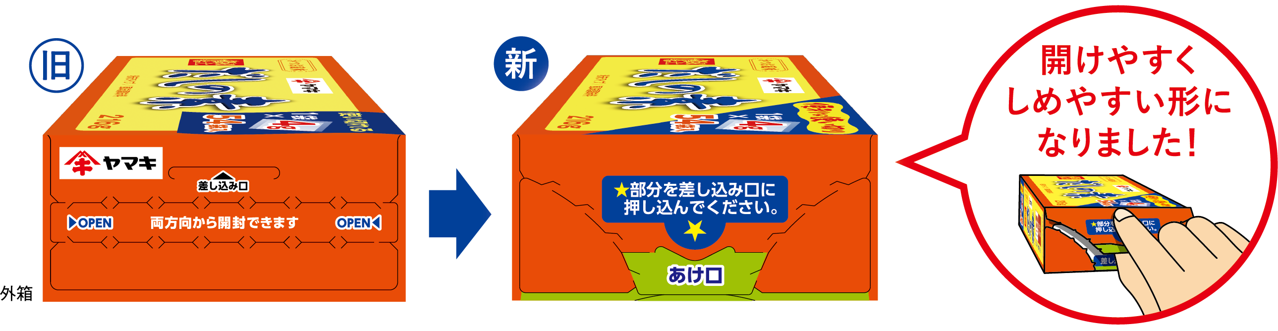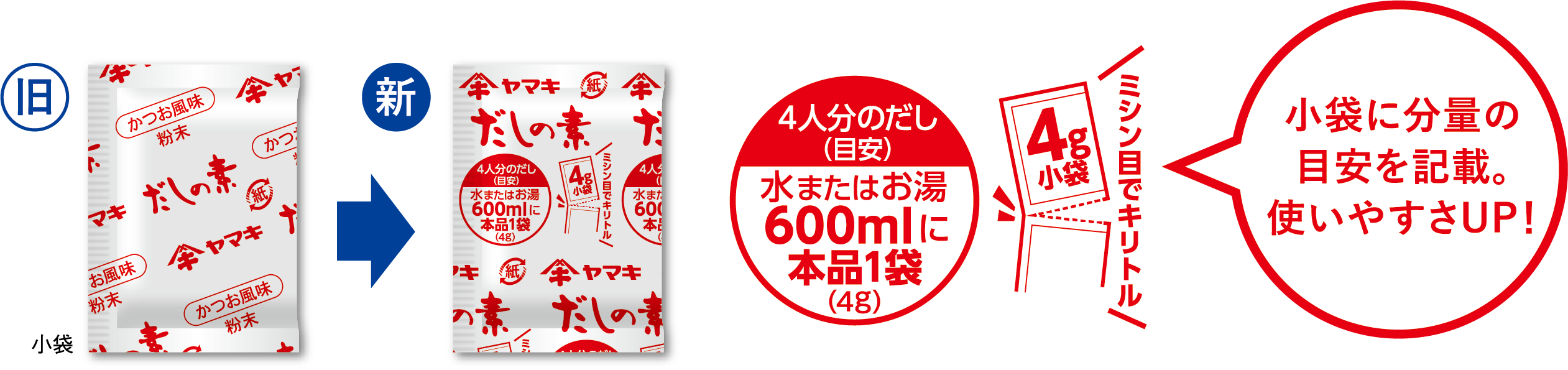 今回のリニューアルでは、お客様からいただいた声を活かし、外箱と小袋のパッケージデザインをより使いやすく、分かりやすいものに変更しました。開封口の形状は、より開けやすく閉めやすい形に、小袋には分量の目安を明記しました。また、パッケージ表面には商品のポイントである「便利な使い切り」のアイコンを追加しました。
