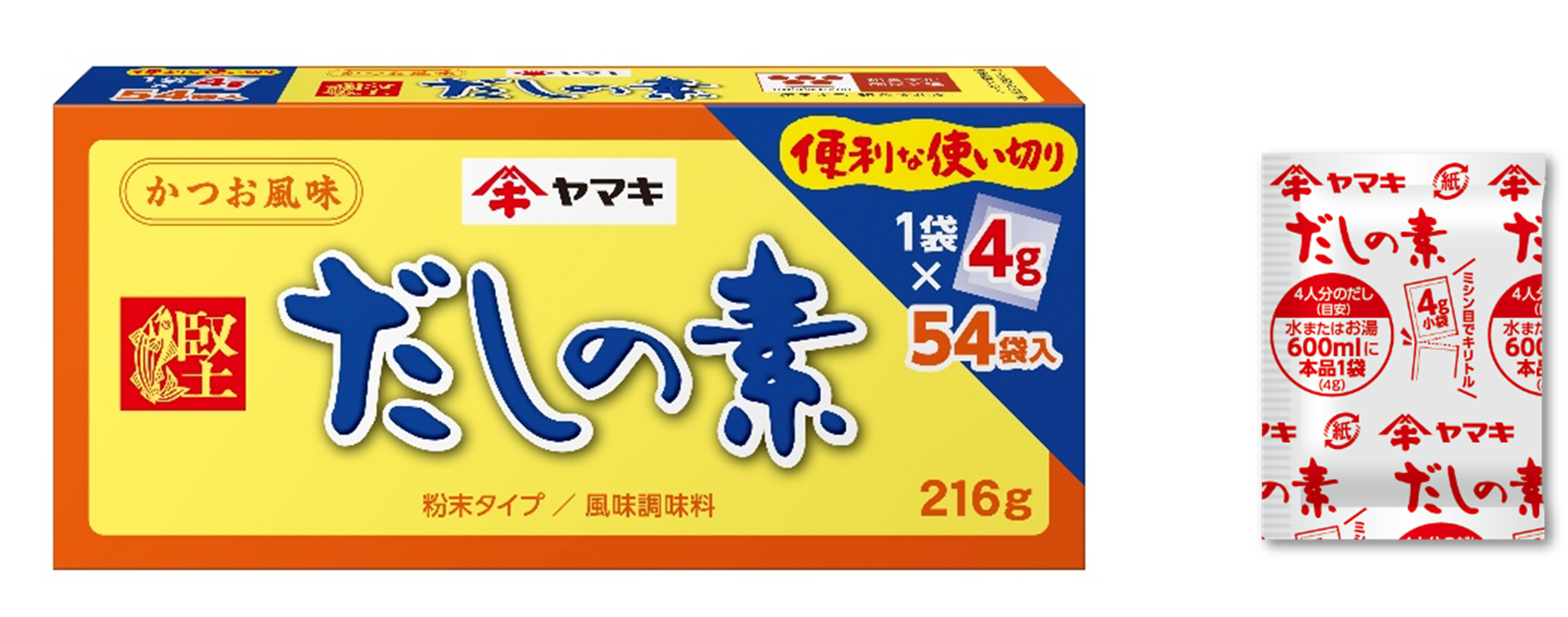 ヤマキ株式会社(本社:愛媛県伊予市 代表取締役社長:城戸善浩)は、『だしの素216g』の外箱と小袋のパッケージデザインをリニューアルして発売します。