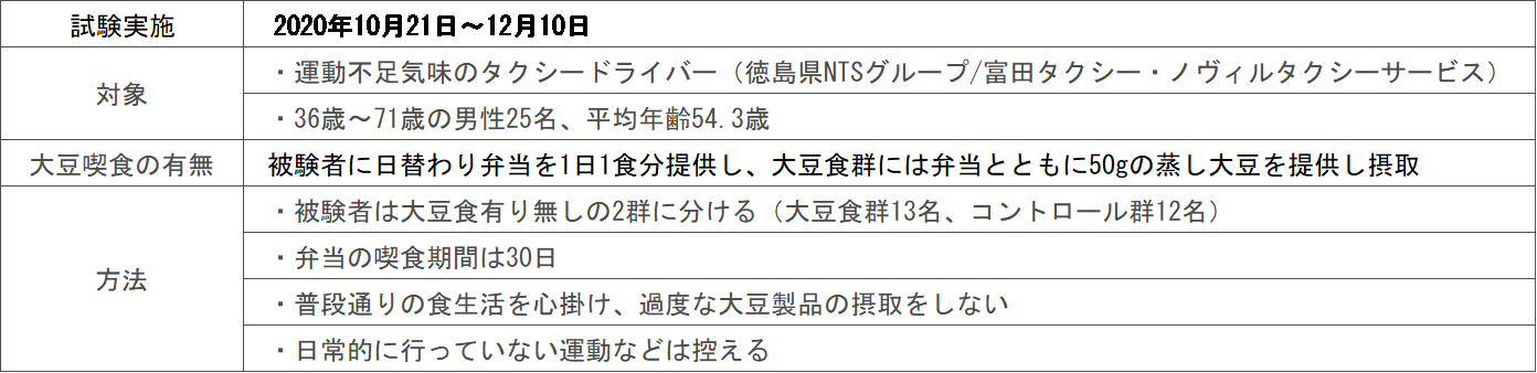 本臨床試験では、健康な男性タクシードライバーを対象に、蒸し大豆の摂取が筋量、筋力、および筋パフォーマンスに有益な影響を及ぼすかどうかを検討しました。その結果、大豆食を1ヵ月間毎日摂取することで、運動不足のタクシードライバーの骨格筋量と筋力が増加することが確認されました。我々の知る限り、本研究は、大豆の摂取が運動不足の健常人の筋機能に及ぼす有益な効果について報告した最初の研究です。