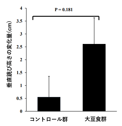 跳躍テストの結果、大豆食群では、コントロール群と比較して、跳躍力が向上する傾向がみられました。しかし、大豆食群とコントロール群の跳躍テストの結果に統計的な有意差は認められませんでした(p = 0.181)。