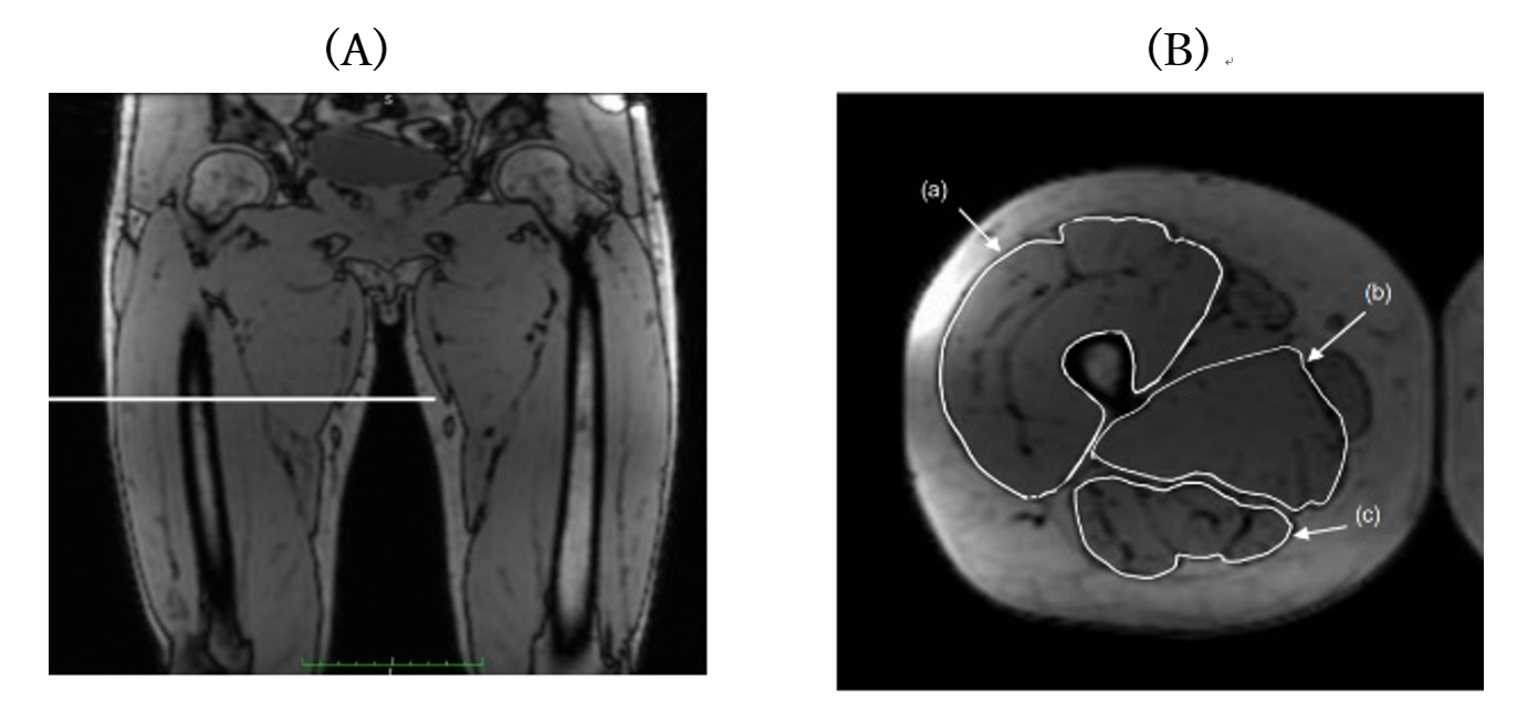 (B)右大腿部の断面画像上における筋群の分割。(a) (b) (c)はそれぞれ大腿四頭筋、内転筋、ハムストリングスを示しています。