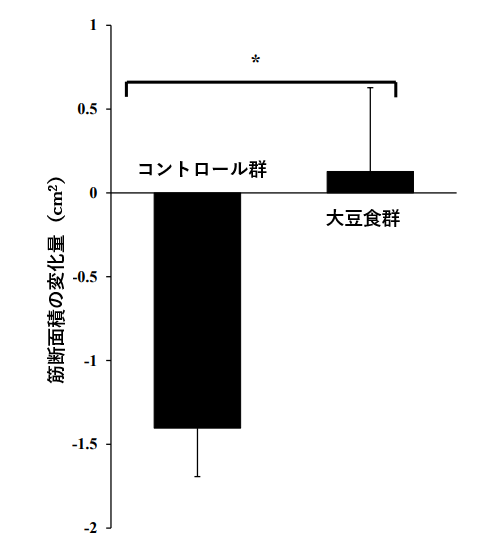 一方、大豆食群では筋量の減少はみられず、1ヵ月の大豆摂取期間後、大腿四頭筋断面積は0.12 cm2増加していました。