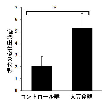 大豆食群でみられた大豆摂取に伴う筋断面積の増加と一致して、大豆食群はコントロール群と比較して握力も増加させました。大豆食群における握力の増加量は、コントロール群の2倍以上でした。この結果は、大豆摂取が筋力を向上させ、寝たきりに近い状態などによる筋力低下を抑制することを示唆しています。