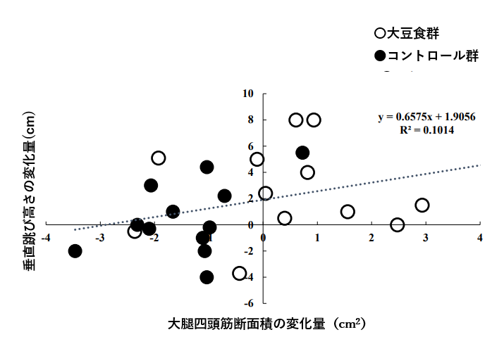 グラフは、大豆食群とコントロール群における筋断面積の変化量と跳躍力の相関について解析しました。