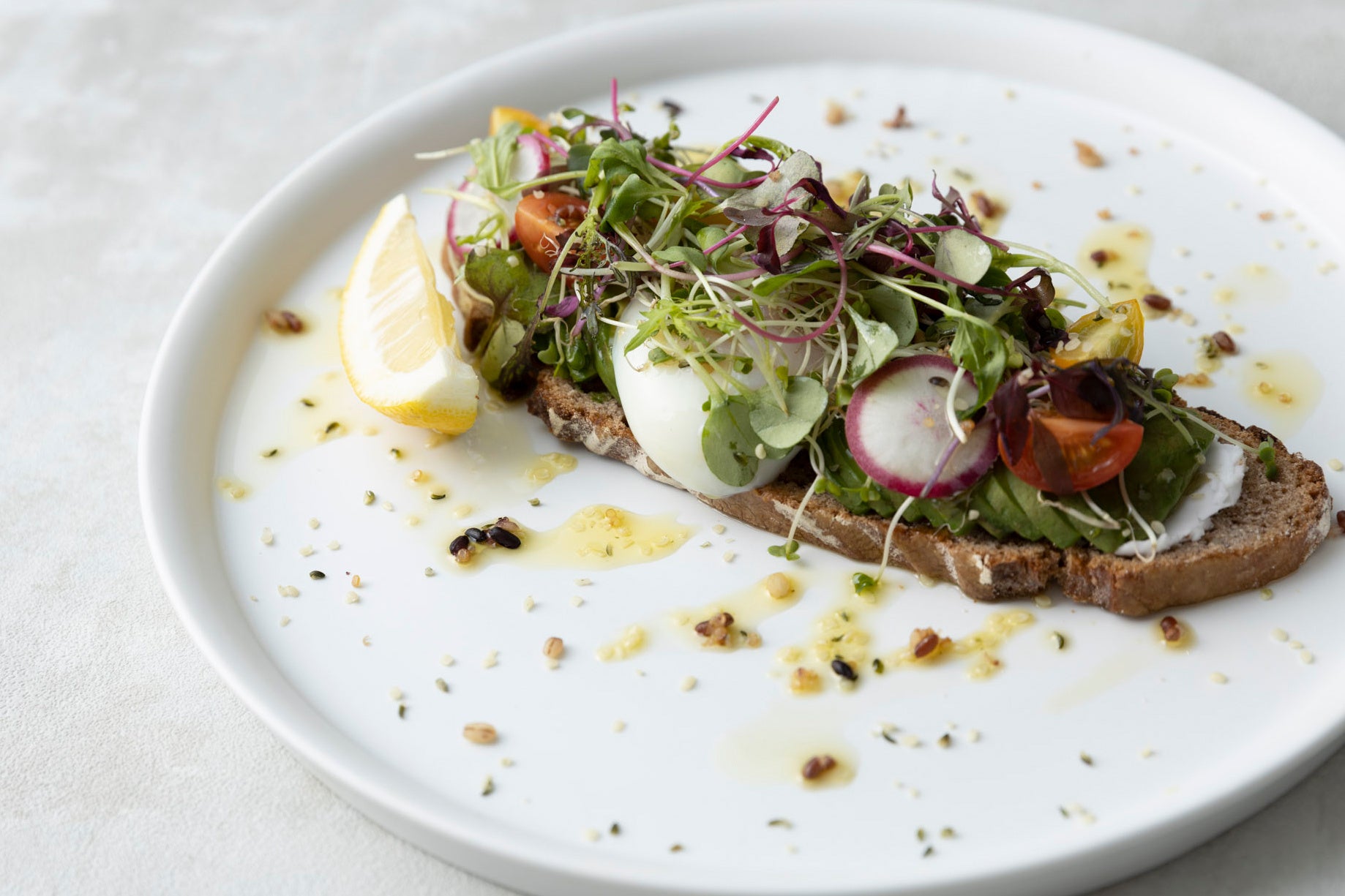 アボカドや季節野菜に、ベトナムの調味料「サテトム」やタヒニ(練り白ごま)、ライムを加えた、ピリ辛なオリジナルペーストで仕上げました。醸造の技が光るこだわりの天然酵母から作られた全粒粉カンパーニュを使用しています。軽食やおつまみとしてもおすすめです。