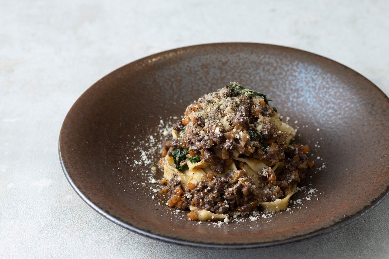 鴨と旬野菜をオーガニックバルサミコと赤ワインでじっくり煮込み、程よい酸昧に奥深いコクと旨みが広がる大人のラグーパスタ。生麺のタリアテッレと、ほんのり香るポルチーニがお酒にもよく合います。