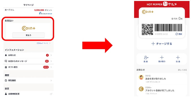 消費者にとっても、『ホットペッパーグルメ』アプリに『COIN+』が組み込まれることで、QR決済が可能となります。この連携により、『ホットペッパーグルメ』アプリで店舗の予約から支払いまでが完結します。