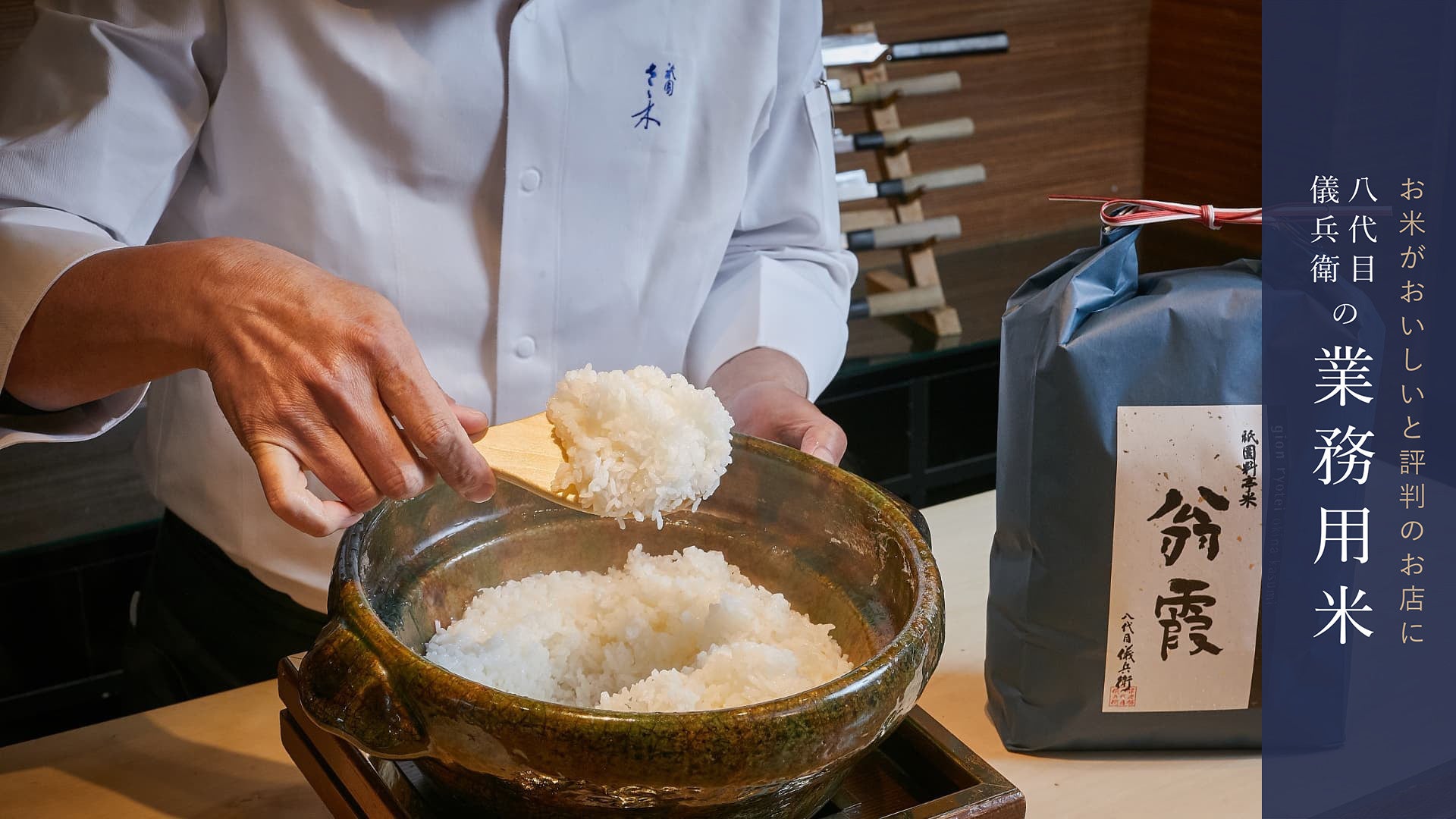 本来「業務用米」というのは、料理人やお店のこだわりに応え、お客様が食べておいしいと感じるお米を提供し続けるためにお米を選定することだと考えています。産地・銘柄を重視するのではなく、プロの料理人の方に納得いだける品質で、コスト以上の価値を生み出し、料理人のこだわりにお米でお応えすることが、八代目儀兵衛の「業務用米」の使命です。
