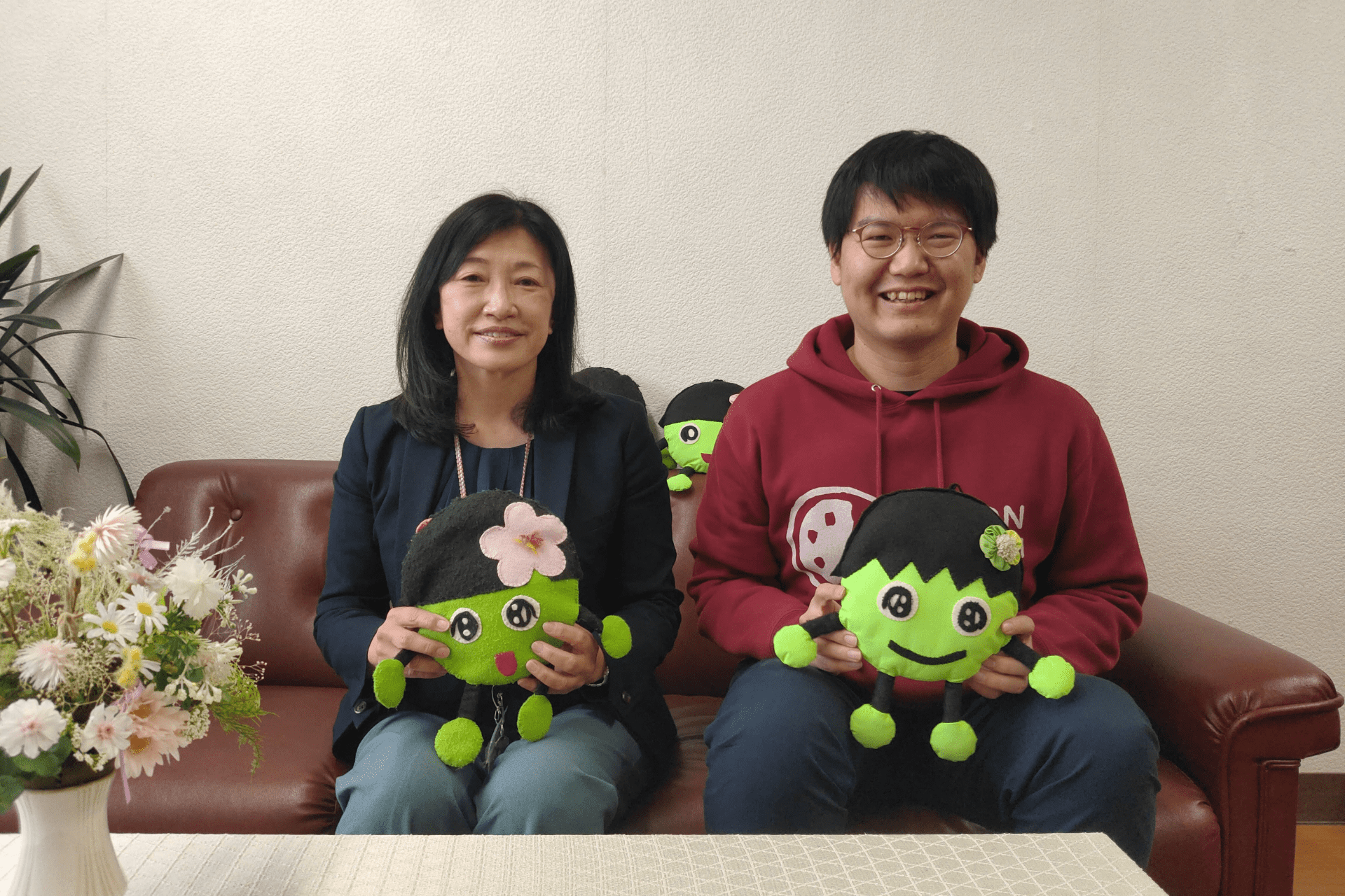 写真左:梅林小学校校長・芦垣 幸代、右:モッタイナイバトン・目取眞 興明