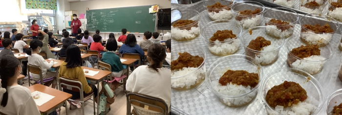 写真左:梅林小学校の授業風景、右:梅カレーの試作