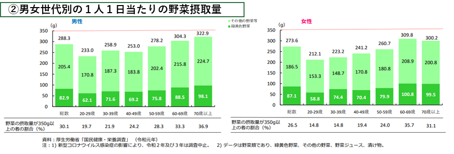 厚生労働省は、健康づくりの指標『健康日本21』における成人1人1日当たりの野菜摂取目標量350gを提唱している。それに対し、摂取量の現状は280g程度で約7割の成人が目標に達しておらず、特に20~40歳代で不足が目立っている。