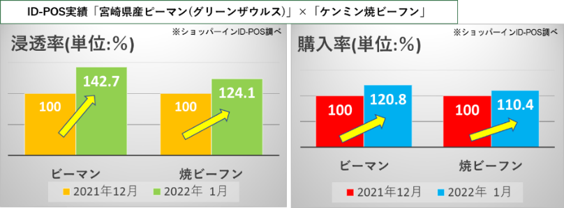 昨年度キャンペーン前月と当月を比較したところ、ビーフン・ピーマンともに浸透率(購入する人の割合)・購入率(購入回数の割合)が増加し、キャンペーン効果が明確に表れており、このキャンペーンを実施することで野菜の消費拡大に貢献したい。