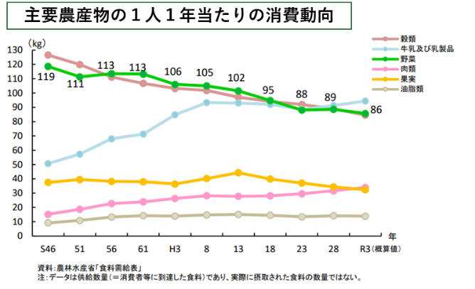 農林水産省の「食料需給表」の国内の主要農産物の消費動向をみると、一人当たりの野菜の消費量は減少傾向が続いている。人口増加も見込めない現在では、日本全体の消費量の減少傾向は続くと予測される。(※野菜の消費動向は、緑色折れ線を参照)