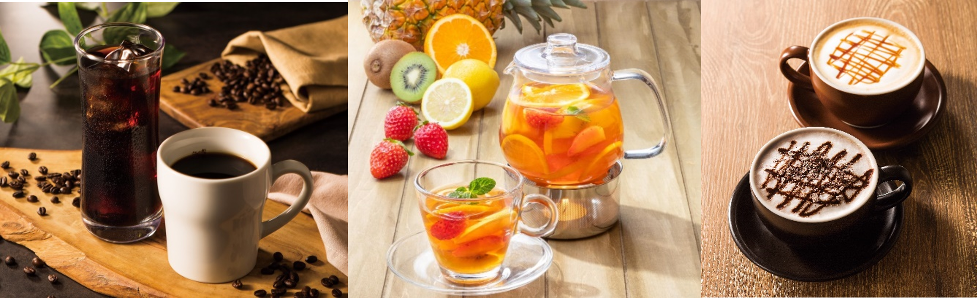 100%オーガニック、レインフォレスト・アライアンス W認証の珈琲豆を使用した「ブレンド珈琲・アメリカン珈琲」やフルーツと珈琲・ティーを合わせた新感覚の「フルーツ with 珈琲&ティー」、スムージーやフローズンドリンクなど、スイーツメニューにもぴったりのバラエティに富んだドリンクメニューをご用意しております。
