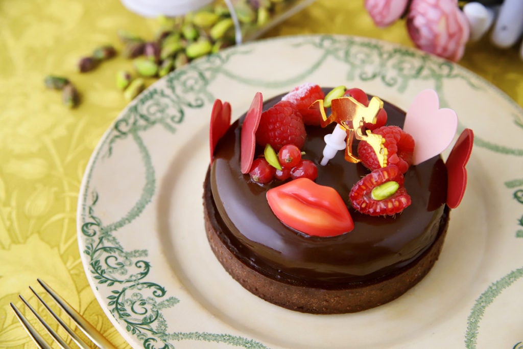 なめらかなハイカカオショコラムースに香ばしいピスタチオのアーモンドクリームをあわせました。奥深いショコラにフランボワーズのコンフィチュールがアクセント。