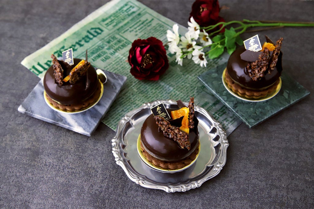 ミルクチョコキャラメルムースとオレンジクレームを、スパイスをきかせたビスキュイ生地とあわせ、香りや味わいが絶妙にあわさったスイーツ。